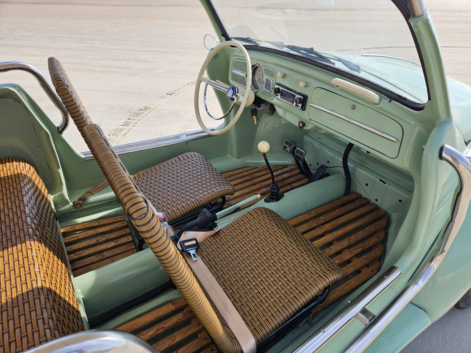 Body-color 15” steel wheels feature chrome VW-stamped hubcaps and are fitted with brand new tires. Stopping power is provided by front and rear drum brakes.
