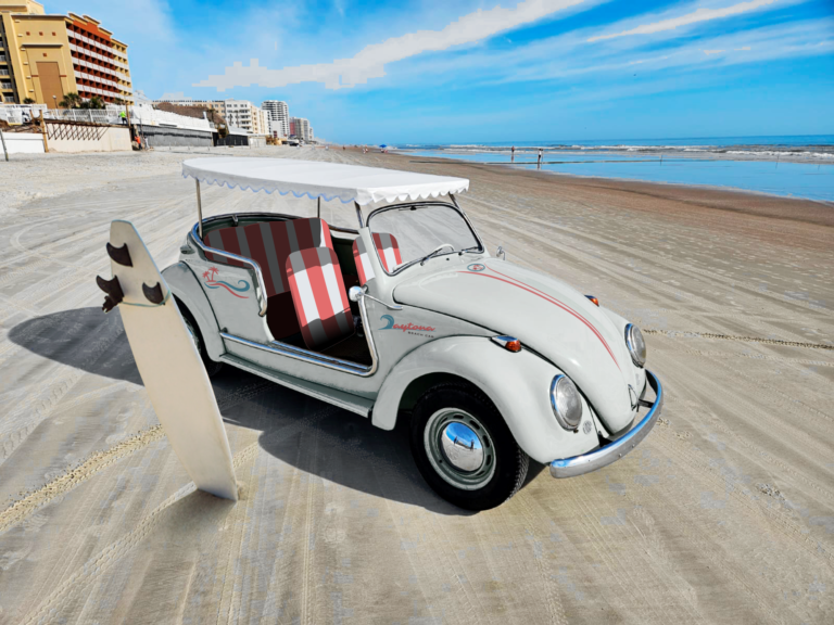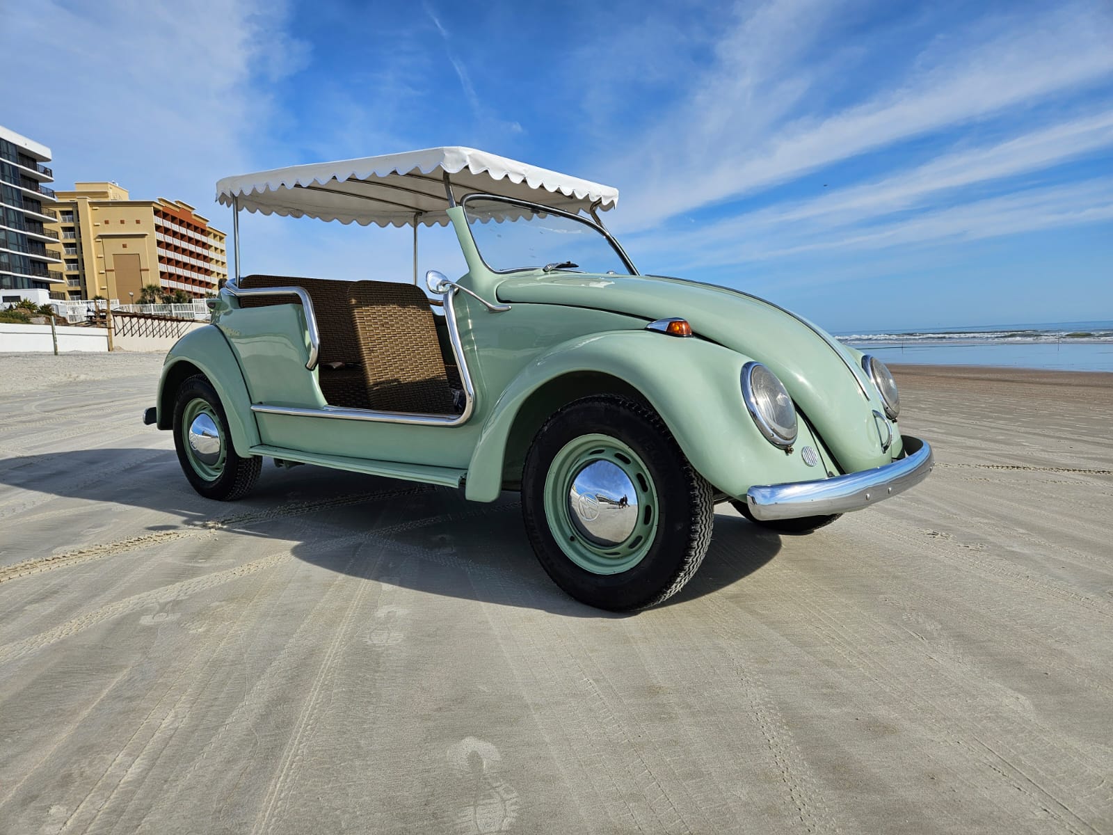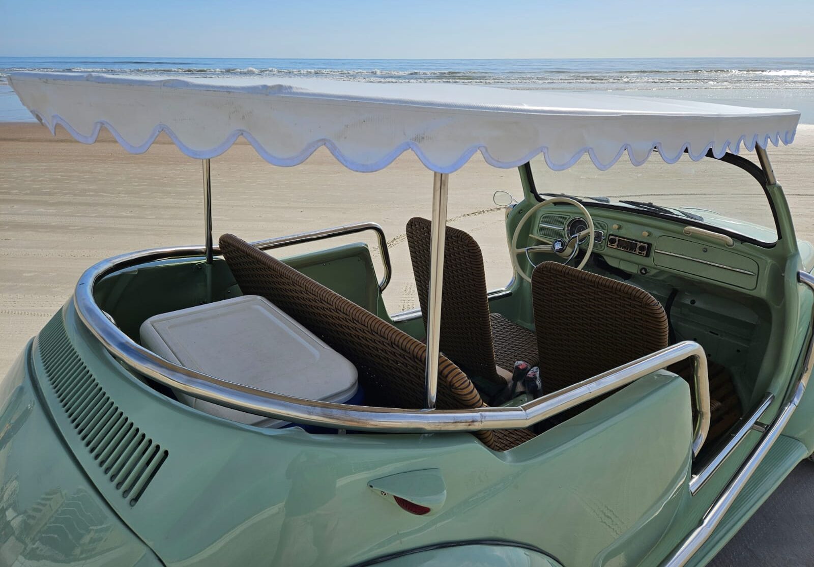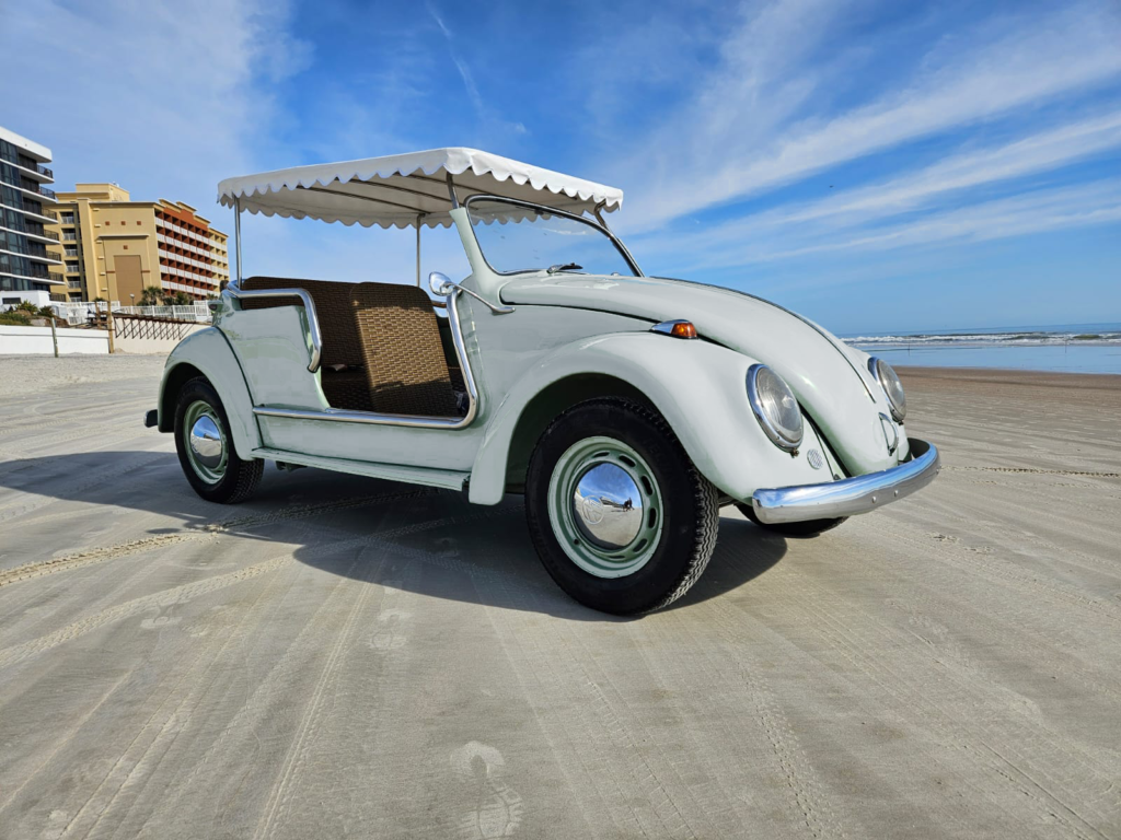 Chrome bumpers. Exterior details include a white surrey-style top with scalloped edges, dual side mirrors and a polished tubular grab rails.